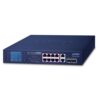 • specifications_tab: <table style="width:100%;" class="common_table_sky"><thead><tr><th colspan="2">Hardware Specifications</th></tr></thead><tbody><tr><td class="align-middle">Copper Ports</td><td>10 10/100/1000BASE-T copper Ports (ports 1 to 10)</td></tr><tr><td class="align-middle">802.3af/802.3at PoE+ Injector Port</td><td>8 ports with 802.3af/802.3at PoE+ Injector function (ports 1 to 8)</td></tr><tr><td class="align-middle">SFP Slots</td><td>2 1000BASE-X SFP Slots (ports 11 to 12)</td></tr><tr><td class="align-middle">Switch Architecture</td><td>Store-and-Forward</td></tr><tr><td class="align-middle">Switch Fabric</td><td>24Gbps/non-blocking</td></tr><tr><td class="align-middle">Switch Throughput@64 bytes</td><td>18Mpps@64 bytes</td></tr><tr><td class="align-middle">MAC Address Table</td><td>8K entries</td></tr><tr><td class="align-middle">Maximum Frame Size</td><td>9216 bytes</td></tr><tr><td class="align-middle">Flow Control</td><td>IEEE 802.3x pause frame for full duplex; back pressure for half duplex</td></tr><tr><td class="align-middle">LED</td><td>System:<br />  Power (<font color="Green"><b>Green</b></font>)<br /> PoE interfaces:<br />  PoE-in-Use (<font color="Orange"><b>Orange</b></font>)<br /> 10/100/1000BASE-T RJ45 Interfaces:<br />  10/100Mbps LNK/ACT (<font color="Red"><b>Red</b></font>)<br />  1000Mbps LNK/ACT (<font color="Green"><b>Green</b></font>)<br /> 1000BASE-X SFP Interfaces:<br />  LNK/ACT (<font color="Green"><b>Green</b></font>)</td></tr><tr><td class="align-middle">LCD Monitor (W x D)</td><td>40.6mm x 30.5mm, 2-inch</td></tr><tr><td class="align-middle">Buttons</td><td>Menu, Enter, Back, Up and Down</td></tr><tr><td class="align-middle">Dimensions (W x D x H)</td><td>280 x 180 x 44mm (1U height)</td></tr><tr><td class="align-middle">Enclosure</td><td>Metal</td></tr><tr><td class="align-middle">Weight</td><td>1671g</td></tr><tr><td class="align-middle">Power Requirements</td><td>100~240V AC, 50/60Hz, 2.5A max.</td></tr><tr><td class="align-middle">Power Consumption/Dissipation</td><td>Max. 130 watts/446 BTU</td></tr><tr><td class="align-middle">Thermal Fan</td><td>1</td></tr><tr><td class="align-middle">ESD Protection</td><td>Contact discharge of ±6KV DC<br /> Air discharge of ±8KV DC</td></tr><tr><td class="align-middle">Surge Protection</td><td>±6KV</td></tr></tbody><thead><tr><th colspan="2">Power over Ethernet</th></tr></thead><tbody><tr><td class="align-middle">PoE Standard</td><td>IEEE 802.3af Power over Ethernet/PSE<br /> IEEE 802.3at Power over Ethernet Plus/PSE</td></tr><tr><td class="align-middle">PoE Power Supply Type</td><td>End-span</td></tr><tr><td class="align-middle">PoE Power Output</td><td>Per port 54V DC, 300mA. max. 15.4 watts (IEEE 802.3af)<br /> Per port 54V DC, 600mA. max. 30 watts (IEEE 802.3at)</td></tr><tr><td class="align-middle">Power Pin Assignment</td><td>1/2 (+), 3/6 (-)</td></tr><tr><td class="align-middle">PoE Power Budget</td><td>120 watts</td></tr><tr><td class="align-middle">Max. Number of Class 2 PDs</td><td>8</td></tr><tr><td class="align-middle">Max. Number of Class 3 PDs</td><td>8</td></tr><tr><td class="align-middle">Max. Number of Class 4 PDs</td><td>4</td></tr></tbody><thead><tr><th colspan="2">Standards Conformance</th></tr></thead><tbody><tr><td class="align-middle">Regulatory Compliance</td><td>FCC Part 15 Class A, CE</td></tr><tr><td class="align-middle">Standards Compliance</td><td>IEEE 802.3 10BASE-T<br /> IEEE 802.3u 100BASE-TX<br /> IEEE 802.3ab Gigabit 1000BASE-T<br /> IEEE 802.3z Gigabit SX/LX<br /> IEEE 802.3x Flow control and back pressure<br /> IEEE 802.3af Power over Ethernet<br /> IEEE 802.3at Power over Ethernet Plus<br /> IEEE 802.3az Energy Efficient Ethernet (EEE)</td></tr></tbody><thead><tr><th colspan="2">Environment</th></tr></thead><tbody><tr><td class="align-middle">Operating</td><td>Temperature: -10 ~ 60 degrees C<br /> Relative Humidity: 10 ~ 90% (non-condensing)<br /> * Temperature<40 degrees C; Humidity<90%<br /> Temperature>40 degrees C; Humidity<50%</td></tr><tr><td class="align-middle">Storage</td><td>Temperature: -10 ~ 70 degrees C<br /> Relative Humidity: 5 ~ 90% (non-condensing)</td></tr></tbody></table>