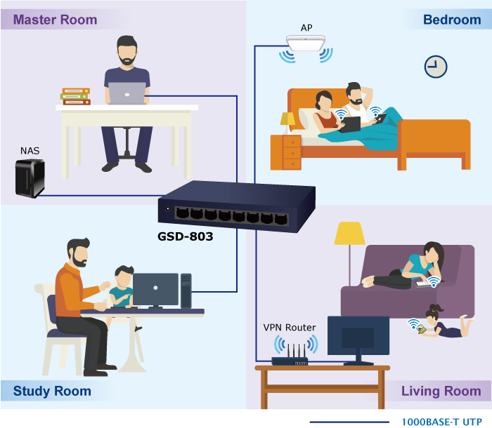 The GSD-803 is designed with a modern, compact metal housing for easy deployment of high-speed Gigabit networking in home or SOHO environments. Providing 16Gbps internal switching fabric, the GSD-803 can handle an extremely large amount of data in a secure topology linking to a backbone or high capacity servers. The GSD-803 provides 8K MAC address table, and offers wire-speed packet transfer performance without risk of packet loss. The high data throughput of the device makes it ideal for most Gigabit environments, especially for the network to be upgraded to a Gigabit environment.
