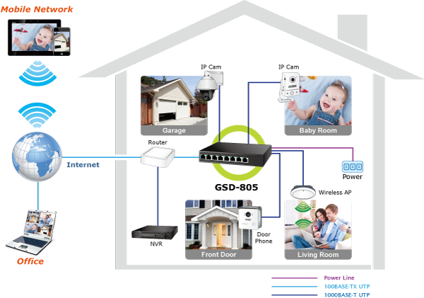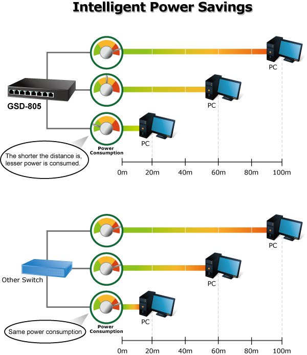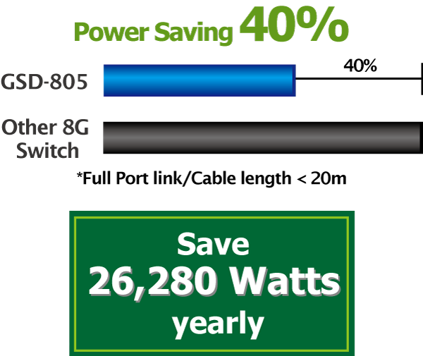 Intelligent scales power, the other technology adopted, is an intelligent algorithm that actively determines the appropriate power level based on cable length. When the GSD-805 is connected with Ethernet cable shorter than 20m, a device can obtain maximum power saving because the GSD-805 would automatically detect the Ethernet cable length and diminish power usage. The connected device can substantially reduce the overall power consumption, which makes a significant contribution to energy saving.