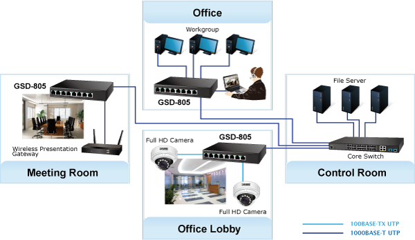 Providing 16Gbps internal switching fabric, the GSD-805 can handle an extremely large amount of data in a secure topology linking to a backbone or high capacity servers. The GSD-805 provides 8K MAC address table, and wire-speed packet transfer performance without risk of packet loss. The high data throughput of the device makes it ideal for Gigabit environments, especially for the network upgraded to a Gigabit environment.