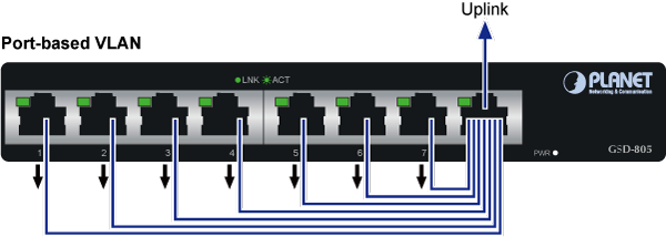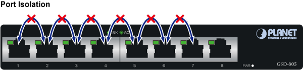The GSD-805 is equipped with the VLAN Isolation feature. When switching the DIP to the “Enable” position, ports 1 to 7 are not able to communicate with one another. This helps to prevent the IP camera’s multicast or broadcast storm from influencing one another.