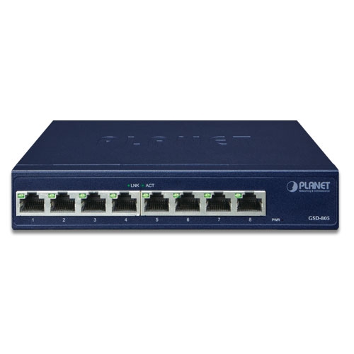 PLANET GSD-805 8-Port 10/100/1000BASE-T Gigabit Ethernet Switch is a green networking solution in line with the energy-saving trend worldwide, but it comes with Gigabit wire-speed performance. Its compact metal housing makes the deployment of Gigabit networks easy for homes, SOHOs and SMBs that are space limited. The operating switch is noiseless as it has a fanless feature. Its internal power supply can be directly plugged into an electrical outlet without having to use a power adapter.