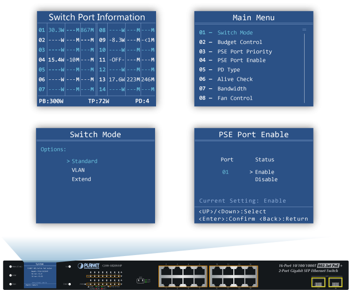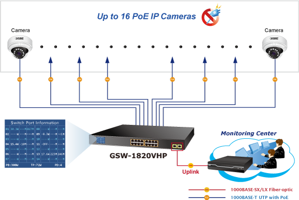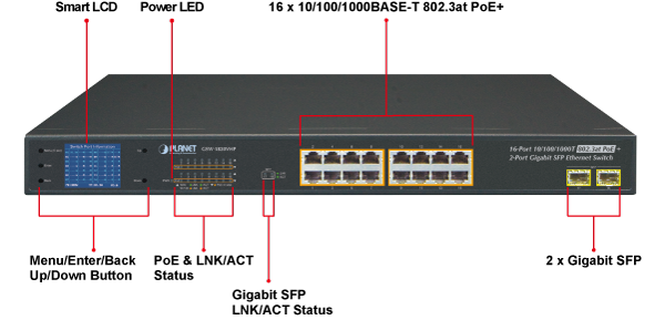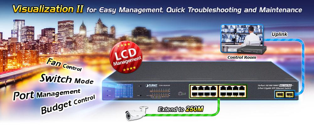 PLANET GSW-1820VHP is an ideal Plug and Watch Power over Ethernet solution which provides quick installation, real-time PoE work status monitoring and immediate troubleshooting through its unique LCD display to improve work efficiency and quality without any PC or software required.