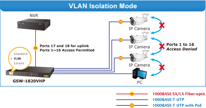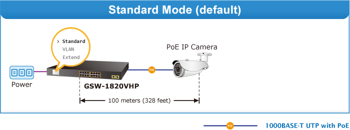 The GSW-1820VHP provides Standard, VLAN and Extend operation modes. The GSW-1820VHP operates as a normal IEEE 802.3af/at PoE Switch in the Standard operation mode. The VLAN operation mode features the port-based VLAN function that can help to prevent the IP camera’s multicast or broadcast storm from influencing each other.