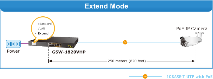 In the Extend operation mode, the GSW-1820VHP operates on a per-port basis at 10Mbps duplex operation but can support 20-watt PoE power output over a distance of up to 250 meters overcoming the 100m limit on Ethernet UTP cable. With this brand-new feature, the GSW-1820VHP provides an additional solution for 802.3af/at PoE distance extension, thus saving the cost of Ethernet cable installation. Its VLAN isolation function isolates ports so as to prevent broadcast storm and defend DHCP spoofing in the Extend operation mode.