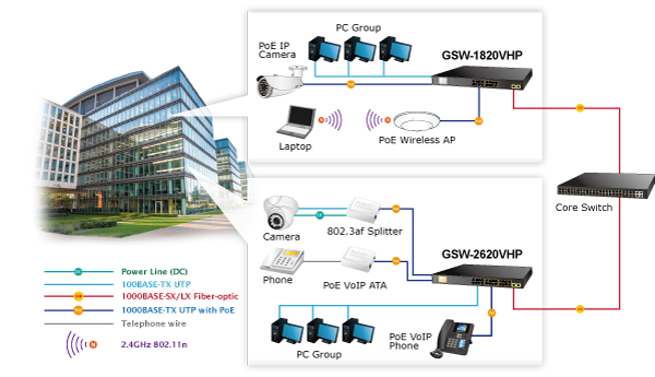Providing sixteen 802.3at PoE+ in-line power interfaces, the GSW-2620VHP can easily build a power that centrally controls IP phone system, IP camera system and wireless AP group for enterprises. Cameras can be installed around the corner in the company or campus for surveillance demands. Without the need for power sockets, the GSW-2620VHP makes the installation of cameras easier and more efficient.