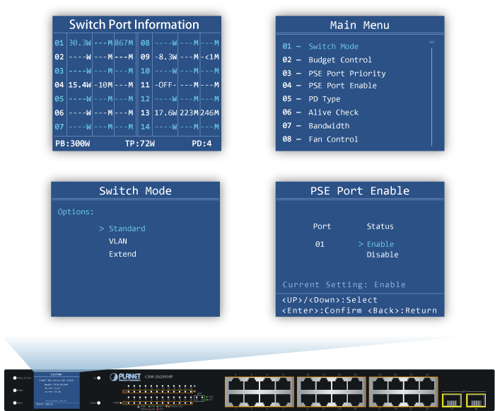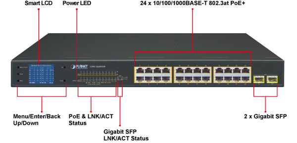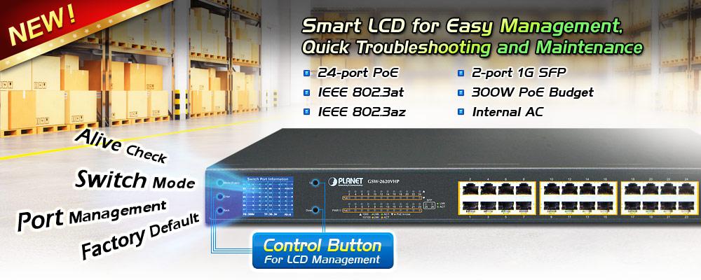 PLANET GSW-2620VHP is an ideal Plug and Watch Power over Ethernet solution which provides quick installation, real-time PoE work status monitoring and immediate troubleshooting through its unique LCD display to improve work efficiency and quality without any PC or software required.