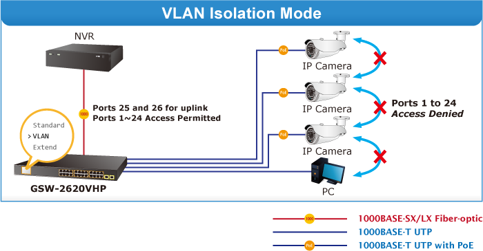 In the Extend operation mode, the GSW-2620VHP operates on a per-port basis at 10Mbps duplex operation but can support 20-watt PoE power output over a distance of up to 250 meters overcoming the 100m limit on Ethernet UTP cable. With this brand-new feature, the GSW-2620VHP provides an additional solution for 802.3af/at PoE distance extension, thus saving the cost of Ethernet cable installation. Its VLAN isolation function isolates ports so as to prevent broadcast storm and defend DHCP spoofing in the Extend operation mode.