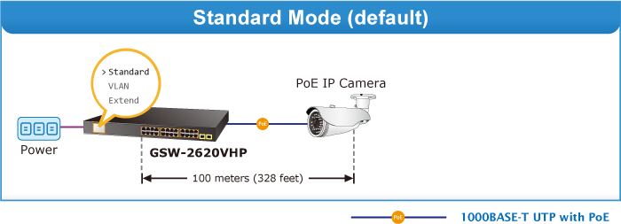 The GSW-2620VHP provides Standard, VLAN and Extend operation modes. The GSW-2620VHP operates as a normal IEEE 802.3af/at PoE Switch in the Standard operation mode. The VLAN operation mode features the port-based VLAN function that can help to prevent the IP camera’s multicast or broadcast storm from influencing each other.