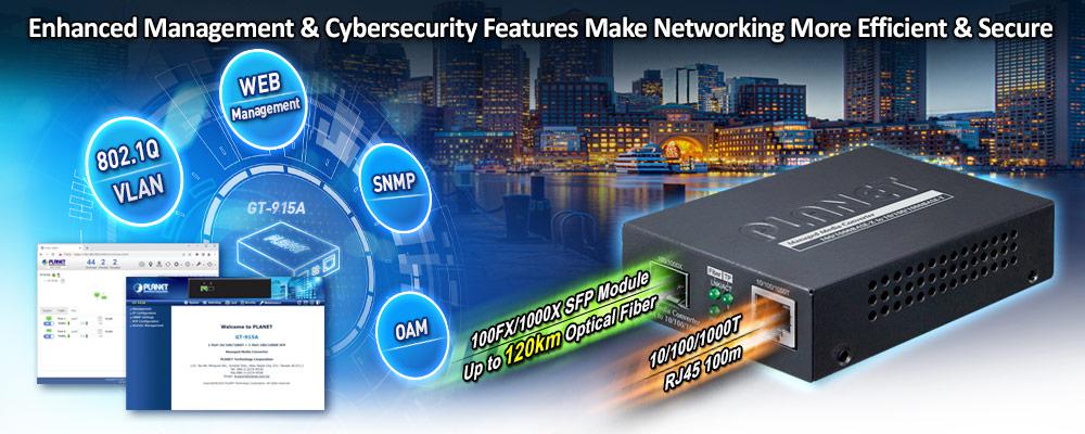The GT-915A can be programmed for advanced management functions such as IP address configuration, DHCP client function, port configuration, converter configuration, 802.1Q tag VLAN, Q-in-Q VLAN, ingress/egress bandwidth control, QoS and Layer protocol filter, and broadcast storm and bandwidth control to enhance bandwidth utilization.