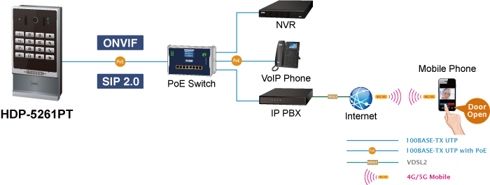 The HDP-5261PT supports SIP 2.0 (RFC 3261) and ONVIF protocols, making it interoperable with IP PBX systems and video management platforms. It integrates easily with VoIP services and IP surveillance infrastructure, providing flexible multimedia communication solutions.