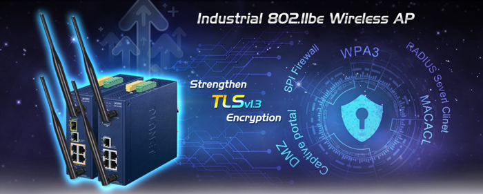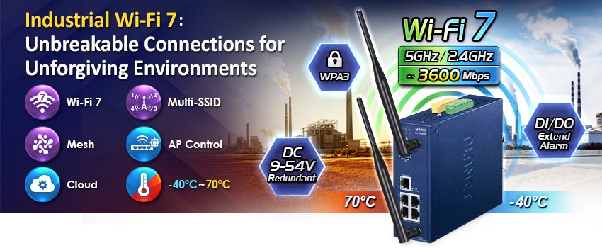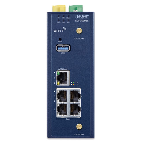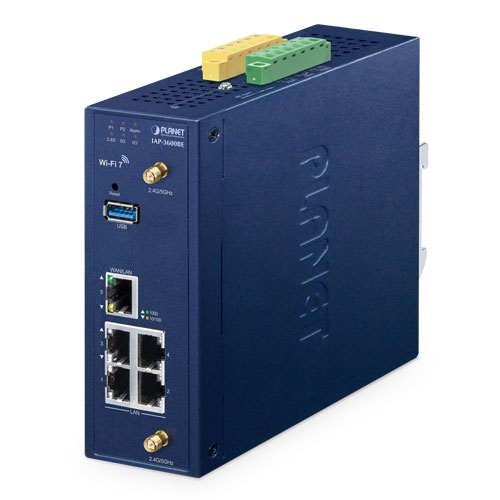 • key_features_tab: <strong><span class="cf0">Physical Interfaces</span></strong> <ul> <li><span class="cf0">4 x 10/100/1000BASE-T RJ45 LAN ports, auto-negotiation, auto MDI/MDI-X (Port 1 to Port 4)</span></li> <li><span class="cf0">1 x 10/100/1000BASE-T RJ45 WAN/LAN port, auto-negotiation, auto MDI/MDI-X (Port 5)</span></li> <li><span class="cf0">2 x dual-band (2.4GHz/5GHz) RP-SMA connectors with antennas</span></li> <li><span class="cf0">1 USB 3.0 port for system configuration backup/upload and firmware upgrade</span></li> <li><span class="cf0">1 x reset button for system factory default and reboot</span></li> </ul>   <strong><span class="cf0">LAN Port</span></strong> <ul> <li><span class="cf0">Hardware-based 10/100Mbps, half/full duplex and 1000Mbps full duplex mode, flow control and auto-negotiation, and auto MDI/MDI-X</span></li> <li><span class="cf0">Features Store-and-Forward mode with wire-speed filtering and forwarding rates</span></li> <li><span class="cf0">IEEE 802.3x flow control for full duplex operation and back pressure for half duplex operation</span></li> <li><span class="cf0">10K jumbo frame</span></li> <li><span class="cf0">Automatic address learning and address aging</span></li> </ul>   <strong><span class="cf0">Industrial Case and Installation</span></strong> <ul> <li><span class="cf0">IP30 metal case protection</span></li> <li><span class="cf0">DIN rail or wall-mount design</span></li> <li><span class="cf0">DC 9-54V, redundant power with reverse polarity protection</span></li> <li><span class="cf0">-40 to 70 degrees C operating temperature</span></li> </ul>   <strong><span class="cf0">Digital Input and Digital Output</span></strong> <ul> <li><span class="cf0">2 Digital Input (DI)</span></li> <li><span class="cf0">2 Digital Output (DO)</span></li> <li><span class="cf0">Integrate sensors into auto alarm system</span></li> </ul>   <strong><span class="cf0">Multiple Operation Modes Options</span></strong> <ul> <li><span class="cf0">Multiple operation modes: AP/Repeater mode, WISP mode and Gateway mode options</span></li> </ul>   <strong><span class="cf0">Industrial-Grade Wireless LAN Compliance</span></strong> <ul> <li><span class="cf0">Supports Wi-Fi 7 (IEEE 802.11be), the latest generation of wireless networking technology</span></li> <li><span class="cf0">Backward compatible with 2.4GHz (802.11b/g/n/ax/be), 5GHz (802.11a/n/ac/ax/be) frequency bands</span></li> </ul>   <strong><span class="cf0">RF Interface Characteristics</span></strong> <ul> <li><span class="cf0">802.11be 2T2R architecture with data rates up to 3600Mbps (688Mbps in 2.4GHz and 2882Mbps in 5GHz)</span></li> <li><span class="cf0">High output power with multi-level adjustable transmit power control</span></li> </ul>   <strong><span class="cf0">Secure Wireless Connection Features</span></strong> <ul> <li><span class="cf0">Full encryption supported: WPA3 Personal,WPA2/WPA3 Personal,WPA2 Personal (AES) ,WPA2 Personal (TKIP),WPA2 Personal (TKIP+AES),WPA/WPA2 Personal (AES) ,WPA/WPA2 Personal (TKIP) , WPA/WPA2 Personal (TKIP+AES) , WPA2 Enterprise, WPA/WPA2 Enterprise</span></li> <li><span class="cf0">MAC-based Access Control Lists (ACL) for enhanced device-level security</span></li> </ul>   <strong><span class="cf0">Wireless AP Mode Features</span></strong> <ul> <li><span class="cf0">Supports OFDMA (orthogonal frequency division multiple access) </span></li> <li><span class="cf0">Supports MU-MIMO (multi-user multiple-input multiple-output), Beamforming and BSS Coloring</span></li> <li><span class="cf0">WMM (Wi-Fi multimedia) provides higher priority to multimedia transmitting over wireless</span></li> <li><span class="cf0">Coverage threshold to limit the weak signal of clients occupying session</span></li> <li><span class="cf0">Real-time Wi-Fi channel analysis chart and client limit control for better performance</span></li> <li><span class="cf0">Terminal Seamless Roaming with 802.11k, 802.11v, and 802.11r</span></li> <li><span class="cf0">NEW: Supports Wi-Fi 7 enhancements, including:</span> <ul> <li><span class="cf0">4096-QAM for higher data rates</span></li> <li><span class="cf0">Multi-Link Operation (MLO) for simultaneous multi-band transmission</span></li> </ul> </li> </ul>   <strong><span class="cf0">Gateway Mode Features</span></strong> <ul> <li><span class="cf0">Built-in RADIUS server/Client</span></li> <li><span class="cf0">Captive Portal</span></li> <li><span class="cf0">UPnP</span></li> <li><span class="cf0">IP routing protocol supports RIPv1/v2, OSPF</span></li> <li><span class="cf0">PLANET DDNS/Easy DDNS</span></li> <li><span class="cf0">SPI firewall, DDoS block, system security and NAT ALGs</span></li> <li><span class="cf0">MAC address/IP/Web filtering and QoS</span></li> <li><span class="cf0">DMZ and port forwarding</span></li> </ul>   <strong><span class="cf0">Easy Deployment and Management</span></strong> <ul> <li><span class="cf0">Supports PLANET AP Controllers in AP mode </span></li> <li><span class="cf0">Self-healing mechanism through system auto reboot setting</span></li> <li><span class="cf0">System status monitoring through remote syslog server</span></li> <li><span class="cf0">PLANET Smart Discovery Utility for deployment management</span></li> <li><span class="cf0">PLANET NMS system and CloudViewer for deployment management</span></li> </ul>