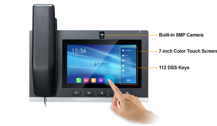 • product_editor_4421_tab_content: <strong>Highlights</strong> <ul> <li>7-inch color touch screen with Android OS</li> <li>5MP camera with 1080p@30fps H.264 video call</li> <li>IETE SIP compliant with Transport Layer Security</li> <li>Up to 20 SIP lines with 112 one-touch DSS keys</li> <li>Dual Gigabit and IEEE 802.3at PoE+ compliant</li> <li>Built-in 2.4G/5GHz Dual-Band Wi-Fi</li> <li>Wideband G.722 HD and Opus audio codec with handset and hands-free function</li> <li>Supports bracket installation for desktop or wall mounting.</li> </ul>   <strong>Audio and Video Features</strong> <ul> <li>1080p@30fps HD H.264 video call</li> <li>Audio codec: Opus, G.722, G.711a/u, G.729, G.729A, G.729B, G.729AB, iLBC</li> <li>DTMF: In-band, Out-of-band (RFC 2833) and SIP INFO</li> <li>Full-duplex hands-free speakerphone with AEC</li> <li>Noise Reduction (NR) and Packet Loss Concealment (PLC)</li> </ul>   <strong>Phone and Call Control Features</strong> <ul> <li>Up to 3-party video/audio mixed conferencing and 10-party audio conferencing</li> <li>Direct IP call without SIP proxy or IP PBX</li> <li>Caller ID display, speed dial, do not disturb (DND)</li> <li>One-touch speed dial, hotline, black/white list call filter</li> <li>Local phonebook (2000 entries), remote phonebook (XML/LDAP, 2000 entries)</li> <li>Call logs (In/out/missed, 1000 entries)</li> </ul>   <strong>Network and Management</strong> <ul> <li>Integrated web server provides web-based administration and configuration.</li> <li>Telephone keypad configuration via display menu/navigation</li> <li>OpenVPN, VLAN and QoS support</li> <li>Auto-provisioning via FTP, TFTP, HTTP/HTTPS, DHCP OPT66, SIP PNP, TR-069</li> </ul>
