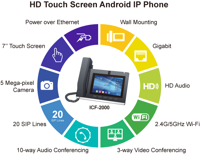 The ICF-2000 is a 7-inch high-definition color touch screen SIP conference phone with a built-in 5MP camera. This latest innovative advanced color IP multimedia phone creates an immersive, face-to-face experience over the network. Through the powerful combination of  Android OS technologies and design, it supports a greater compatibility and more powerful functions. Its large display and movable icons on interface provide the direct access to frequently-used functions and intelligent touch full keypad with ease of use. Its high resolution makes video conferencing very practical, comfortable and high-quality.