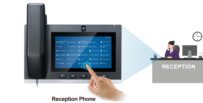 The ICF-2000 is also highly suitable for reception desks, providing front desk staff with a professional and efficient communication tool. The 7-inch color touch screen is equipped with 112 one-touch DSS keys and supports up to 20 SIP lines, enabling receptionists to easily manage a high volume of incoming and outgoing calls. The design, which combines a touch screen with physical buttons, allows quick access to various functions, while customizable DSS keys can be set for call forwarding, speed dialing, or activating specific phone features, helping to streamline and improve call handling efficiency.