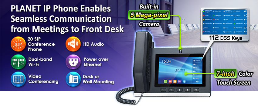 • product_editor_4418_tab_content: <strong>Versatile Communication Solution</strong> The ICF-2000 is a multifunctional IP phone suitable for conference rooms, reception desks, and access control systems. It supports 10-way audio conferencing and 3-way video conferencing, effectively facilitating online collaboration within the company and significantly enhancing communication efficiency. The ICF-2000 combines a touch screen with physical buttons, providing intuitive and simple operation along with a user-friendly interface for an exceptional user experience.   <strong>Ideal Choice for Conference Rooms</strong> The ICF-2000 is especially well-suited for conference applications, supporting multi-party audio and video conferencing, allowing teams to easily engage in online collaboration and discussions. The built-in 5MP camera ensures clear video conferencing, while the 10-way audio conferencing feature delivers high-quality sound, ensuring that every participant can clearly hear the discussion. The 7-inch color touch screen allows meeting hosts to easily manage participants, with customizable DSS keys for quickly setting up meeting modes or inviting new members to enhance meeting efficiency. <img style="display: block; margin-left: auto; margin-right: auto;" src="https://www.planet.com.sa/planet-storage/2025/01/ICF-2000-7.png" alt="" width="700" height="424" /> <strong>Ideal Choice for Reception Desks</strong> The ICF-2000 is also highly suitable for reception desks, providing front desk staff with a professional and efficient communication tool. The 7-inch color touch screen is equipped with 112 one-touch DSS keys and supports up to 20 SIP lines, enabling receptionists to easily manage a high volume of incoming and outgoing calls. The design, which combines a touch screen with physical buttons, allows quick access to various functions, while customizable DSS keys can be set for call forwarding, speed dialing, or activating specific phone features, helping to streamline and improve call handling efficiency. <img style="display: block; margin-left: auto; margin-right: auto;" src="https://www.planet.com.sa/planet-storage/2025/01/ICF-2000-6.png" alt="" width="700" height="355" /> <strong>Flexible Installation Options and Access Control Integration</strong> The ICF-2000 offers both desktop and wall-mounted installation options, featuring an adjustable camera that supports video calls with access control systems. Users can view video footage from the access control system on the phone’s screen and remotely unlock doors. This device not only enhances daily operational efficiency but also optimizes communication processes in the business environment. <img style="display: block; margin-left: auto; margin-right: auto;" src="https://www.planet.com.sa/planet-storage/2025/01/ICF-2000-5.png" alt="" width="700" height="421" />
