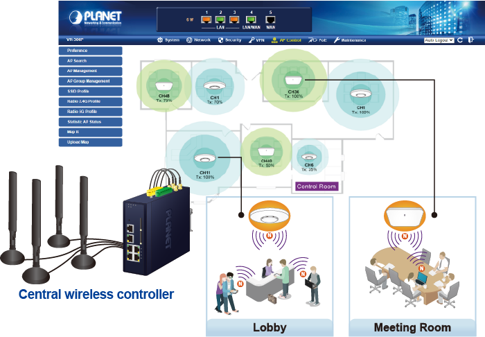 The ICG-2515-NR provides centralized management of PLANET Smart AP series via a user-friendly Web GUI. It’s easy to configure AP for the wireless SSID, radio band and security settings. With a four-step configuration process, wireless profiles for different purposes can be simultaneously delivered to multiple APs or AP groups to minimize deployment time, effort and cost.