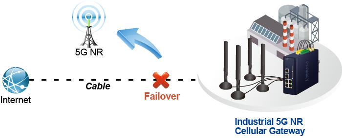 Designed with 5G NR and Gigabit Ethernet WAN interfaces, the ICG-2515-NR ensures Internet connectivity by featuring failover functionality between 5G NR and GbE WAN. The ICG-2515-NR provides flexibilty to set priority for 5G NR or GbE WAN connection. When the main WAN interface fails, the secondary WAN interface will automatically back up the connection to ensure always-on connectivity.