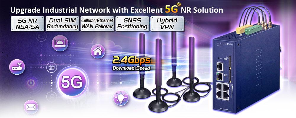 • product_editor_4418_tab_content: <strong>5G NR Cellular Communication Solution</strong> PLANET ICG-2515-NR adopts 5G NR cellular technology and thus breaks the 100m limitation of RJ45 transmission. To avoid data loss affected by an unexpected breakdown connection on the part of ISP, the ICG-2515-NR provides dual SIM card slots, failover, load balance functions and advanced features like VLAN, VPN, Modbus, and network management to cover more applications. <p style="text-align: center;"><img src="https://www.planet.com.sa/planet-storage/2025/01/ICG-2515-NR-5.png" alt="" width="700" height="406" /></p> <p style="text-align: center;"><img src="https://www.planet.com.sa/planet-storage/2025/01/ICG-2515-NR-6.png" alt="" width="700" height="403" /></p>