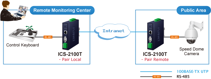 Using pair connection mode via the fiber optic patch cord, the ICS-2100T can extend the distance of the deployed devices via RS232, RS422 and RS485 interfaces, making the remote management of these devices from the monitoring center easier and efficient.