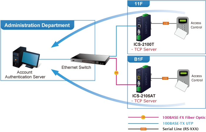 Most of the enterprises and government use access control plate and Mifare or RFID to authorize entrance identity. Traditionally, the access control machines use RS232 or RS485 serial interface with their cables connecting to login server. By applying the ICS-2100T Serial Device Server, the access control machine is able to extend the network over longer distances via Ethernet interfaces. In addition, the ICS-2100T can be linked to an xDSL router to get the internet access capability so that the access control can be set and monitored over the internet.