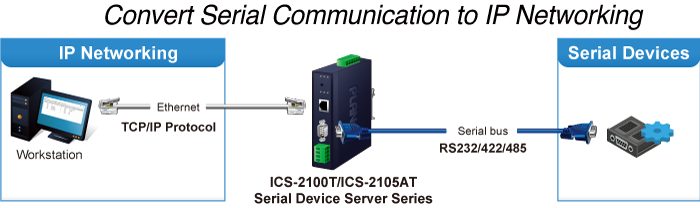 PLANET ICS-2100T Serial Device Server is specially designed to convert RS232, RS422 or RS485 serial communication to Industrial Fast Ethernet networking so as to extend the network distance efficiently and inexpensively. There is one 10/100BASE-TX RJ45 port in the ICS-2100T and its operating temperature ranges from -40 to 75 degrees C for your network needs. The ICS-2100T is a time-saving and cost-effective solution for users and system integrators to quickly transform their serial devices into the Ethernet network with no need of replacing the existing serial devices and software system.