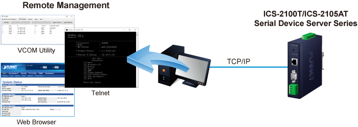 - Telnet console management- Windows-based VCOM utility supports searching, monitoring and configuration setting- IP NTP (Network Time Protocol) and DNS management