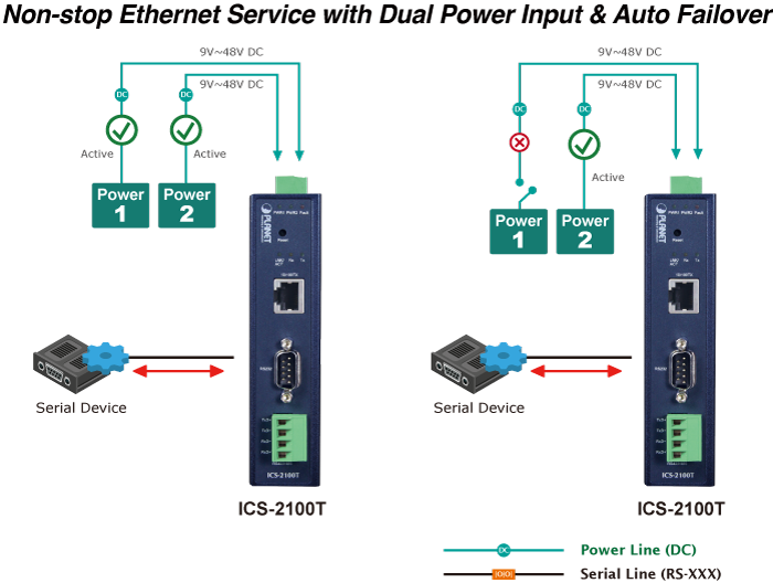 The ICS-2100T features a strong dual power input system with wide-ranging voltages (9V~48V DC / 24V AC) incorporated into customer’s automation network to enhance system reliability and uptime. In the example below, when Power Supply 1 fails to work, the hardware failover function will be activated automatically to keep powering the ICS-2100T via Power Supply 2 without any break of operation.