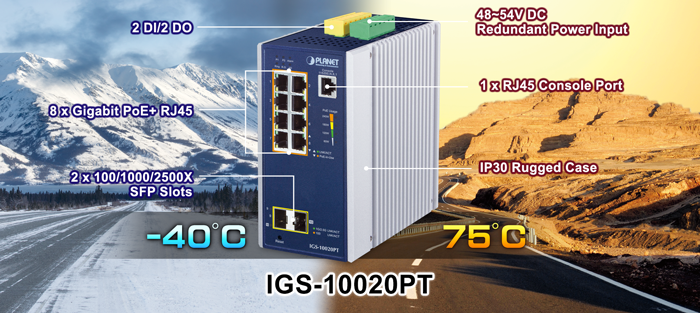 PLANET IGS-10020PT Industrial 8-port Gigabit 802.3at PoE+ Switch is equipped with a rugged IP30 metal case for stable operation in heavy industrial environments. Thus, the IGS-10020PT provides a high level of immunity against electromagnetic interference and heavy electrical surges which are usually found on plant floors or in curbside traffic control cabinets.