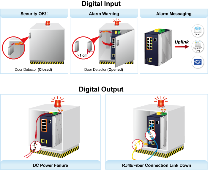 The IGS-10020PT supports Digital Input and Digital Output on its upper panel. This external alarm enables users to use Digital Input to detect and log external device status (such as door intrusion detector), and send event alarm to the administrators. The Digital Output could be used to alarm the administrators if the IGS-10020PT port shows link down, link up or power failure.