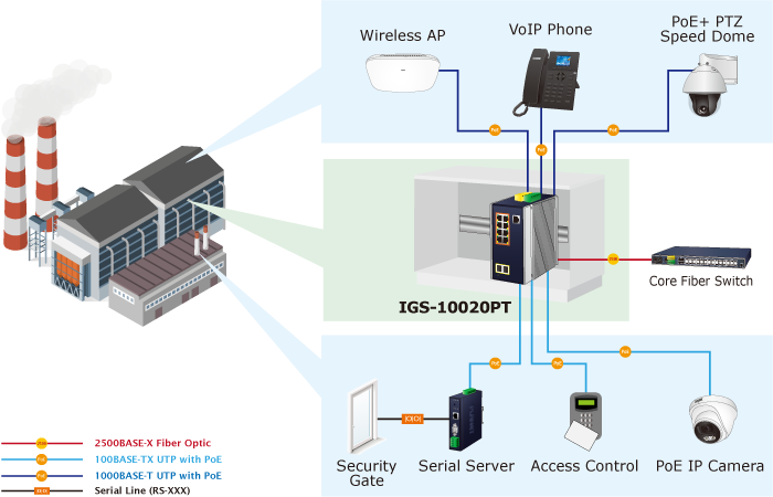 To fulfill the demand of High Power PoE for network applications with Gigabit speed transmission under wide temperature, the IGS-10020PT provides 8 10/100/1000Mbps ports featuring IEEE 802.3at Power over Ethernet Plus (PoE+) that combines up to 36-watt power output and data per port over one Cat5E/6 Ethernet cable. As the whole system comes with a total 240-watt PoE budget, the IGS-10020PT is designed specifically to satisfy the growing demand of higher power consuming network PDs (powered devices) such as multi-channel (802.11a/b/g/n) wireless LAN access points, PTZ (Pan, Tilt & Zoom)/Speed Dome network cameras and other PoE network devices, doubling that of the current conventional 802.3af PoE.