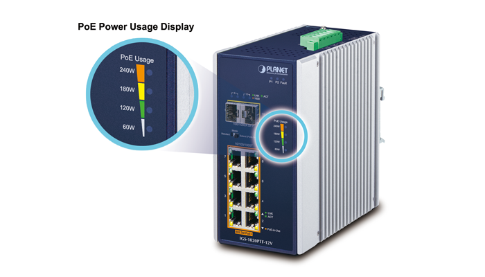 The IGS-1020PTF-12V helps users to monitor the current status of PoE power usage easily and efficiently by its advanced LED indication. Called “PoE Power Usage”, the front panel of the Industrial Gigabit PoE+ Switch has four orange LEDs indicating 60W, 120W, 180W and 240W of PoE power usage.