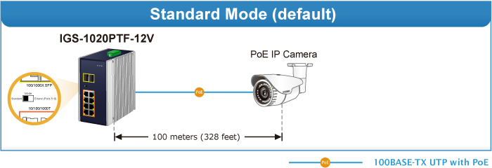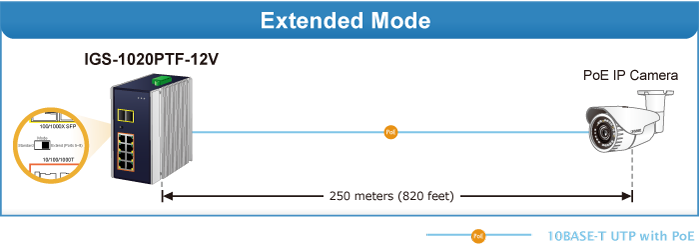 The IGS-1020PTF-12V has a built-in solid DIP switch providing “Standard” and “Extend” operation modes. The IGS-1020PTF-12V operates as a normal IEEE 802.3at PoE+ Switch in the “Standard” operation mode. In the “Extend” operation mode, the IGS-1020PTF-12V operates on a per-port basis at 10Mbps full duplex operation and can support 20~25-watt PoE power output over a distance of up to 250 meters, overcoming the 100-meter limit on Ethernet UTP cable.