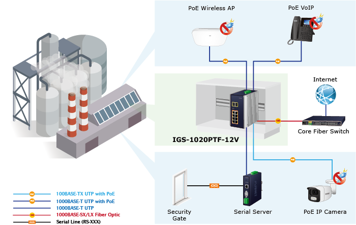 • applications_tab: <strong>Industrial-grade PoE+ Switch for Building Automation and Security</strong> Suitable for buildings where security is strictly enforced, the IGS-1020PTF-12V, with eight Gigabit Ethernet 802.3at PoE+ in-line power interfaces, can easily build a power centrally controlled for an IP phone system, IP surveillance system, and wireless AP group in the harsh Industrial environment. For instance, 8 PoE IP cameras or PoE wireless APs can be easily installed for surveillance demands or a wireless roaming environment in the industrial area can be built. Without the power-socket limitation, the IGS-1020PTF-12V makes the installation of IP cameras or wireless APs easier and more efficient. <img style="display: block; margin-left: auto; margin-right: auto;" src="https://www.planet.com.sa/planet-storage/2025/01/IGS-1020PTF-12V_v2-11.png" alt="" width="700" height="442" /> <strong>Perfect Integration Solution for IP PoE Camera and NVR System</strong> The IGS-1020PTF-12V provides eight 10/100/1000BASE-T 802.3at PoE+ ports which can offer sufficient PoE power to 8 PoE IP cameras at the same time. In addition, with the two 100/1000BASE-X SFP interfaces, the IGS-1020PTF-12V can connect to a core fiber switch and send video streams to an NVR and monitoring center. Through the high-performance switch architecture, the IGS-1020PTF-12V facilitates the recorded video files from the 8 PoE+ IP cameras to be saved in the NVR systems. Furthermore, the NVR systems can be controlled and monitored in both the local LAN and the remote site via Internet. The IGS-1020PTF-12V undoubtedly brings an ideal secure surveillance system at a lower total cost. <img style="display: block; margin-left: auto; margin-right: auto;" src="https://www.planet.com.sa/planet-storage/2025/01/IGS-1020PTFv2-11.png" width="700" height="524" />