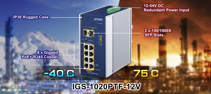 • product_editor_4418_tab_content: <strong>Industrial-grade PoE+ Switch for Building Automation and Security</strong> Suitable for buildings where security is strictly enforced, the IGS-1020PTF-12V, with eight Gigabit Ethernet 802.3at PoE+ in-line power interfaces, can easily build a power centrally controlled for an IP phone system, IP surveillance system, and wireless AP group in the harsh Industrial environment. For instance, 8 PoE IP cameras or PoE wireless APs can be easily installed for surveillance demands or a wireless roaming environment in the industrial area can be built. Without the power-socket limitation, the IGS-1020PTF-12V makes the installation of IP cameras or wireless APs easier and more efficient. <img style="display: block; margin-left: auto; margin-right: auto;" src="https://www.planet.com.sa/planet-storage/2025/01/IGS-1020PTF-12V_v2-11.png" alt="" width="700" height="442" /> <strong>Perfect Integration Solution for IP PoE Camera and NVR System</strong> The IGS-1020PTF-12V provides eight 10/100/1000BASE-T 802.3at PoE+ ports which can offer sufficient PoE power to 8 PoE IP cameras at the same time. In addition, with the two 100/1000BASE-X SFP interfaces, the IGS-1020PTF-12V can connect to a core fiber switch and send video streams to an NVR and monitoring center. Through the high-performance switch architecture, the IGS-1020PTF-12V facilitates the recorded video files from the 8 PoE+ IP cameras to be saved in the NVR systems. Furthermore, the NVR systems can be controlled and monitored in both the local LAN and the remote site via Internet. The IGS-1020PTF-12V undoubtedly brings an ideal secure surveillance system at a lower total cost. <img style="display: block; margin-left: auto; margin-right: auto;" src="https://www.planet.com.sa/planet-storage/2025/01/IGS-1020PTFv2-11.png" width="700" height="524" />