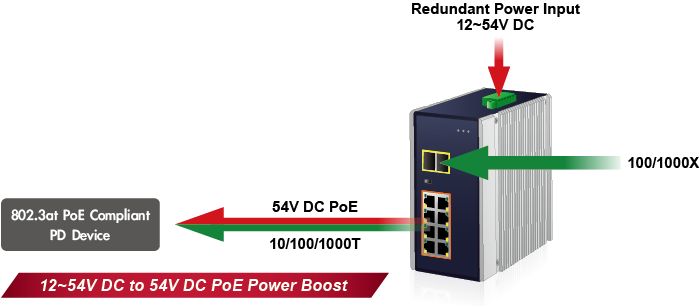 To facilitate the 802.3at PoE+ usage with the commonly-used 12~54V DC power input for transportation and industrial-level applications, the IGS-1020PTF-12V adopts 12~54V DC to 54V DC power boost technology to solve power source issue but does not require special power supplies. Its wide-ranging voltages design is suitable for worldwide operability with high availability applications requiring dual or backup power inputs.