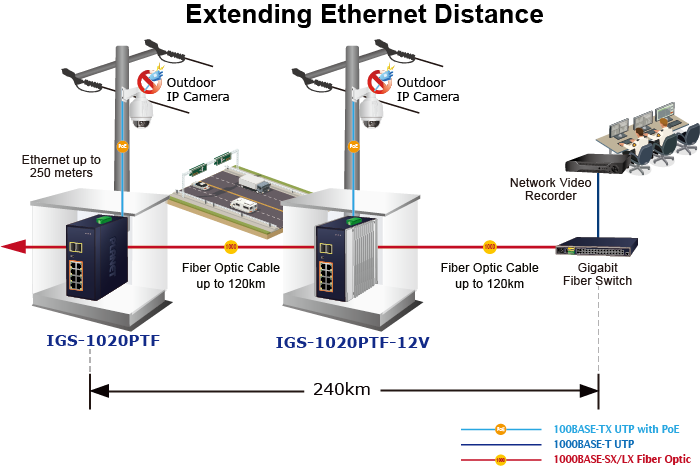 The additional two mini-GBIC slots built in the IGS-1020PTF-12V supports SFP auto-detection and dual speed as it features 100BASE-FX and 1000BASE-SX/LX SFP (small form-factor pluggable) fiber-optic modules, meaning the administrator now can flexibly choose the suitable SFP transceiver according to the transmission distance or the transmission speed required to extend the network efficiently. The distance can be extended from 550 meters to 2 kilometers (multi-mode fiber) and  to 10/20/40/60/80/120 kilometers (single-mode fiber or WDM fiber). They are well suited for applications to uplink to backbone switch and monitoring center in long distance.