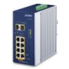 Featuring Plug and Play designed to be installed in heavy industrial demanding environments, PLANET IGS-1020PTF-12V is an Industrial-grade, DIN-rail type Unmanaged Gigabit Ethernet PoE+ Switch with eight 10/100/1000BASE-T ports featuring IEEE 802.3at PoE+ and two 100/1000BASE-X fiber optic interfaces for uplink connection.