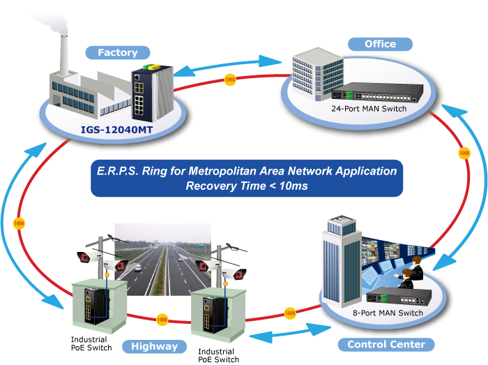 The IGS-12040MT supports redundant ring technology and features strong rapid self-recovery capability to prevent interruptions and external intrusions. It incorporates advanced ITU-T G.8032 ERPS (Ethernet Ring Protection Switching) technology, Spanning Tree Protocol (802.1s MSTP), and redundant power input system into customer’s industrial automation network to enhance system reliability and uptime in harsh factory environments. In a certain simple Ring network, the recovery time of data link can be as fast as 10ms.