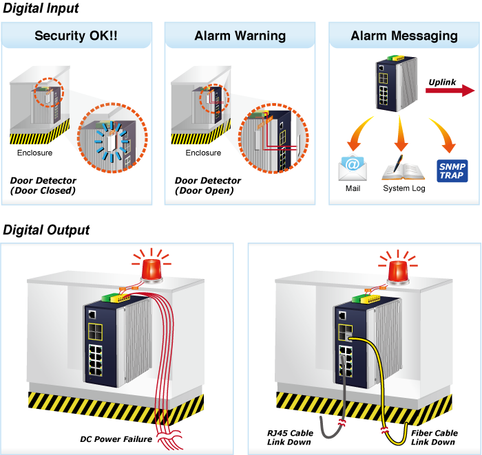 The IGS-12040MT supports Digital Input and Digital Output on its upper panel. The external alarm enables users to use Digital Input to detect external device’s status (such as door intrusion detector), and send event alarm to the administrators. The Digital Output could be used to alarm the administrators if the IGS-12040MT port is link-down, link-up or power-dead.