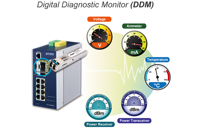 The IGS-12040MT supports SFP-DDM (Digital Diagnostic Monitor) function that greatly helps network administrator to easily monitor real-time parameters of the SFP, such as optical output power, optical input power, temperature, laser bias current, and transceiver supply voltage.