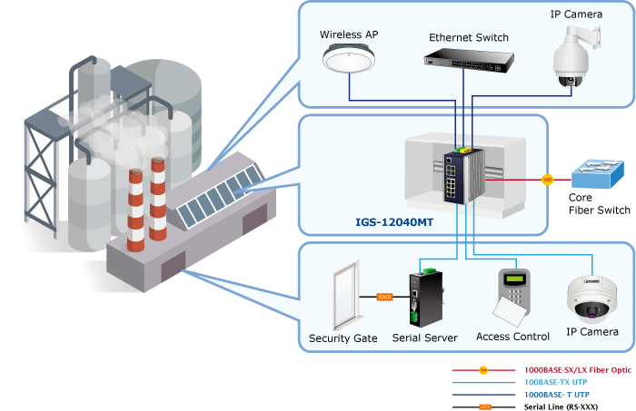The IGS-12040MT can operate stably under the temperature range from -40 to 75 degrees C and allows either DIN-rail or wall mounting for efficient use of cabinet space. With 4 triple-speed SFP fiber ports, it can flexibly extend the connection distance.