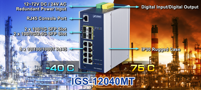 With IP30 aluminum industrial case protection, the IGS-12040MT provides a high level of immunity against electromagnetic interference and heavy electrical surges which are usually found on plant floors or in curb side traffic control cabinets. It also possesses an integrated power supply source with a wide range of voltages (12 to 72V DC or 24V AC) for worldwide high availability applications requiring dual or backup power inputs. Being able to operate under the temperature range from -40 to 75 degrees C, the IGS-12040MT can be placed in almost any difficult environment.