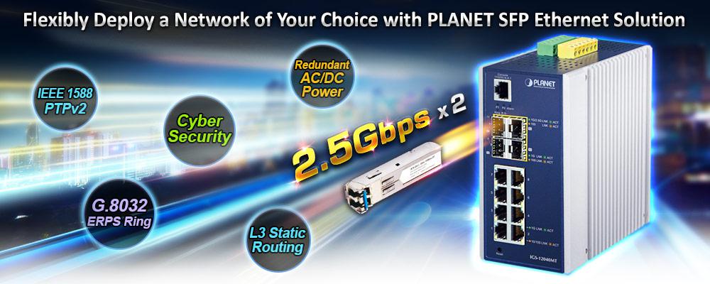 PLANET IGS-12040MT is a fully-managed Gigabit fiber switch usually designed for the industrial network. It features 8 10/100/1000BASE-T copper ports, 2 100/1000BASE-X SFP ports, 2 100/1000/2500BASE-X SFP ports and redundant power system in an IP30 rugged but compact-sized case that can be installed in any difficult environment without space limitation. It provides user-friendly yet advanced IPv6/IPv4 management interfaces, abundant L2/L4 switching functions and Layer 3 static routing capability.