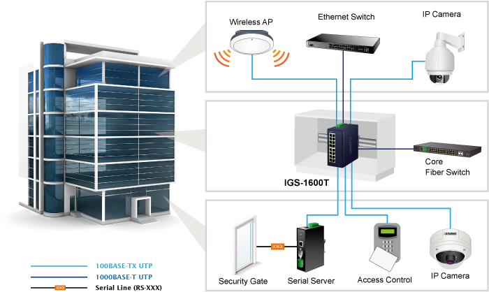 Suitable for buildings where security is strictly enforced, the IGS-1600T, with sixteen Gigabit Ethernet Switch interfaces, can easily build an infrastructure with an IP phone system, IP surveillance system, and wireless AP group in the harsh Industrial environment.