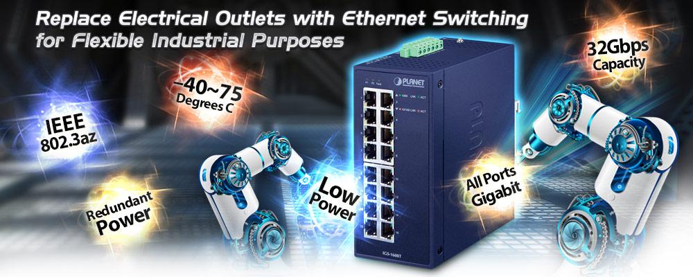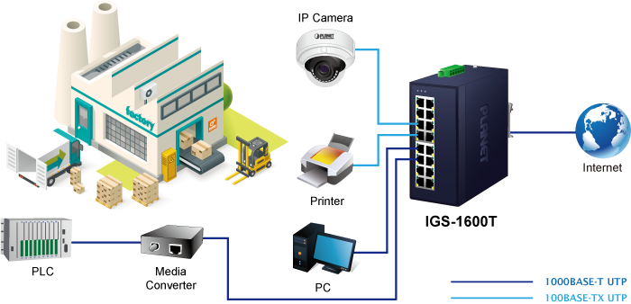 • product_editor_4418_tab_content: <strong>Industrial-grade Switch for Building Automation and Security</strong> Suitable for buildings where security is strictly enforced, the IGS-1600T, with sixteen Gigabit Ethernet Switch interfaces, can easily build an infrastructure with an IP phone system, IP surveillance system, and wireless AP group in the harsh Industrial environment. <img style="display: block; margin-left: auto; margin-right: auto;" src="https://www.planet.com.sa/planet-storage/2025/01/IGS-1600T-1.png" alt="" width="700" height="418" /> <strong>Designed for Heavy Industries</strong> The IGS-1600T’s IP30-rated metal case is particularly designed for heavy industries, such as factories, harbors, warehouses, and more. When installed at these establishments, it can enhance the work performance of these establishments by speedily transferring incoming and outgoing data. <img style="display: block; margin-left: auto; margin-right: auto;" src="https://www.planet.com.sa/planet-storage/2025/01/IGS-1600T-2.png" alt="" width="700" height="338" />