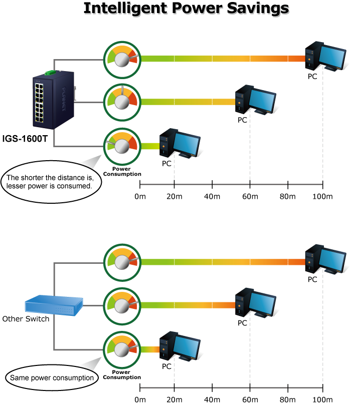 Intelligent power scale is an intelligent algorithm that actively determines the appropriate power level based on cable length. When the IGS-1600T is connected with Ethernet cable shorter than 20m, a device can obtain maximum power savings because the IGS-1600T would automatically detect the Ethernet cable length and diminish power usage. The connected device can substantially reduce the overall power consumption, which makes a significant contribution to energy savings.