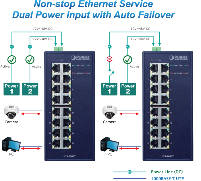 The IGS-1600T features a strong dual power input system with wide-ranging voltages (12V~48V DC or 24V AC) incorporated into customer’s automation network to enhance system reliability and uptime. In the example below, when power supply 1 fails to work, the hardware failover function will be activated automatically to keep powering the IGS-1600T via power supply 2 alternatively without any loss of operation.