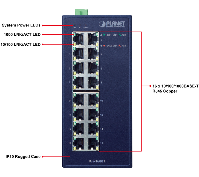 PLANET IGS-1600T Industrial high-density 16-port 10/100/1000T Gigabit Ethernet Switch is equipped with a rugged IP30 metal case for stable operation in heavy industrial demanding environments. Thus, the IGS-1600T provides a high level of immunity against electromagnetic interference and heavy electrical surges which are usually found on plant floors or in curbside traffic control cabinets.