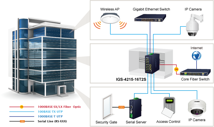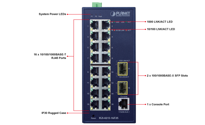 • product_editor_4418_tab_content: <p><strong>Industrial-grade Switch for Building Automation and Security</strong></p> <p>Suitable for buildings where security is strictly to be enforced, the IGS-4215-16T2S / IGS-4215-16T2S-U, with  sixteen high-speed Gigabit Ethernet interfaces, can easily build a power centrally controlled for an IP phone system, IP surveillance system, and wireless AP group in the harsh Industrial environment. </p> <p> </p> <p><img style="display: block; margin-left: auto; margin-right: auto;" src="https://www.planet.com.sa/planet-storage/2025/01/IGS-4215-16T2S-1.png" alt="" width="701" height="418" /></p> <p> </p> <p><strong>Model that Withstands Harsh Operation and Extends Distance</strong></p> <p>The IGS-4215-16T2S / IGS-4215-16T2S-U is made to withstand any harsh operation in such environments as traffic control cabinets, factory floors, and indoor and outdoor locations where temperatures are extremely high or low. With a non-blocking design and compact size, the installation of the IGS-4215-16T2S / IGS-4215-16T2S-U is easy and helpful to build a Gigabit high-bandwidth switched network quickly.</p> <p> </p> <p><img style="display: block; margin-left: auto; margin-right: auto;" src="https://www.planet.com.sa/planet-storage/2025/01/IGS-4215-16T2S-2.png" alt="" width="700" height="449" /></p> <p> </p> <p> </p> <p><strong>ITU-T G.8032 ERPS Makes Data Transmission Uninterrupted </strong></p> <p>The IGS-4215-16T2S / IGS-4215-16T2S-U features strong rapid self-recovery capability to prevent interruptions and external intrusions. It incorporates <strong>ITU-T G.8032 ERPS (Ethernet Ring Protection Switching)</strong> technology into customer’s automation network to enhance system reliability and uptime. Applying the IEEE 802.3at Power over Ethernet standard, the IGS-4215-16T2S / IGS-4215-16T2S-U can directly connect with any IEEE 802.3at end-nodes like PTZ (Pan, Tilt & Zoom) network cameras and speed dome cameras. The IGS-4215-16T2S / IGS-4215-16T2S-U can easily help system integrators with the available network infrastructure to build wireless AP, IP camera and VoIP systems where power can be centrally-controlled.</p> <p> </p> <p> </p> <p style="text-align: center;"><img src="https://www.planet.com.sa/planet-storage/2025/01/Common_Industrial-switch-ERPS_-None-PoE.png" alt="" width="700" height="440" /></p>